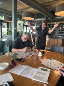 Vrijdagochtend 10 april, 10.00 uur. Op de voorgrond zien we de handen van René W., die de scorekaarten voor de NGF-competitie alvast netjes klaarlegt.